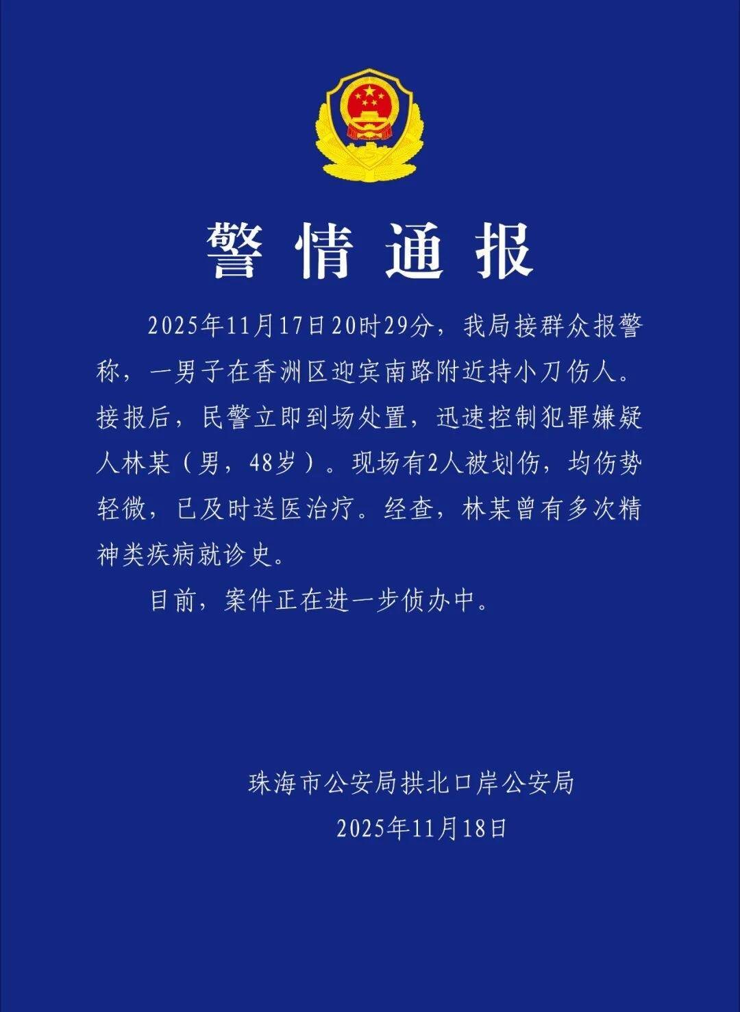 2025年11月17日20时29分,我局接群众报警称,一男子在香洲区迎宾南路附近持小刀伤人。接报后,民警立即到场处置,迅速控制犯罪嫌疑人林某(男,48岁)。现场有2人被划伤,均伤势轻微,已及时送医治疗。经查,林某曾有多次精神类疾病就诊史。